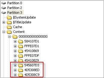 Right off the bat I found out that FTK imager and Encase don't display the partitions on the Xbox hard drive. A few quick Google searches not only provided me with a program to browse the hard drive but the searches also explained the folder structure. The folder structure stores content in a global area that applies to all users and content is stored in each user account's profile. The global area is located at /partition3/content/0000000000000000/TITLEID/OFFERID/ while the content in the user profiles are located at /partition3/content/PROFILEID/TITLEID/OFFERID/. The PROFILEID is the ID of the user account, the TITLEID is the name of game or application that created the folder, and the OFFERID is the type of content the folder stores. I used Kingla's Xbox 360 HDD Folder List website to determine the TITLEID and OFFERID. The picture below shows the global content for my Xbox and the Kinect games' folders are 4D5308ED (Kinect Adventures), 4D5308C9 (Kinect Sports), and 545607D3 (Dance Central).