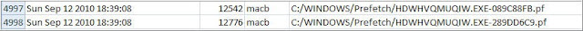 As a reminder, the examination so far has located the following: five copies of the SpyPro (MD5 ce5806f3f3a2afa8efe0272440ae6b2d), two copies of Hiloti (MD5 5170e6923859a70ede3b2685ccd5ba04), and one copy of Hiloti (MD5 30fd84f3c0e0dc7666658dc52c216a2a). The first piece of malware was created on the system at 09/12/10 06:38:42PM.