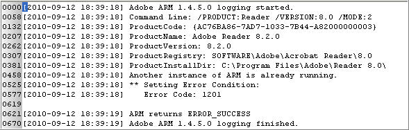 The content of this log file provided some useful information. First was that the Adobe ARM 1.4.5.0 logging was started at 18:39:18 and ended one second later. Second the log showed the version of Adobe Reader on the computer was 8.2 which is outdated since the latest version (at the time of this post) is 9.3.4.