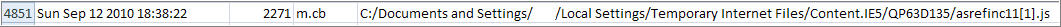 **** The examination has identified two new variants of Hiloti (MD5 a06e417b9743e65bbb9ace16d6d3a65f and MD5 f1abef9bd8240815ceaf97a7527318b2) on the system. Finally, we are at the point in time when the first piece of identified malware was created on the system. The examination up to this point has been looking for artifacts associated with the payload of the attack such as the numerous pieces of malware identified. However, the examination will now start to focus on trying to identify the initial infection vector which resulted in the first piece of malware being dropped to the system.****