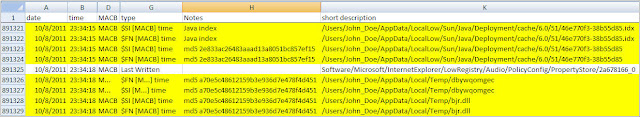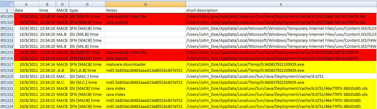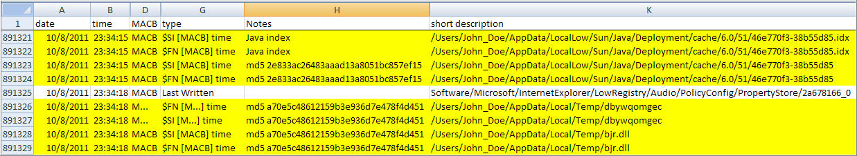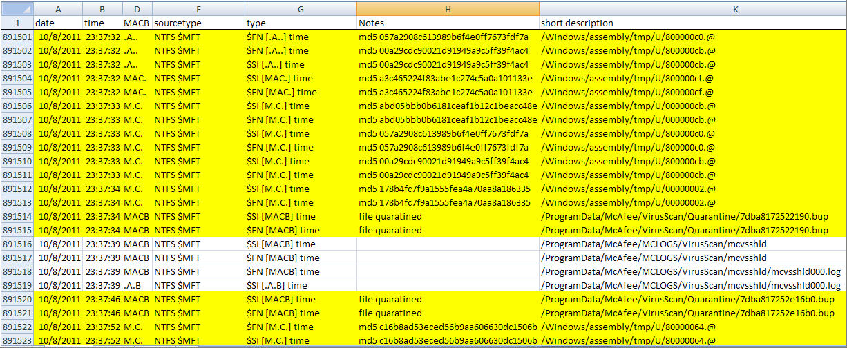 I kept working the timeline going backwards in time. I kept finding more malware and malware artifacts but nothing pointing to an IIV explaining how the malware got onto the system. I finally reached the earliest time I noted which was 10/08/11 11:37:38 PM. There was a lot of activity involving files with similar names to the ones reflected in the McAfee log file.