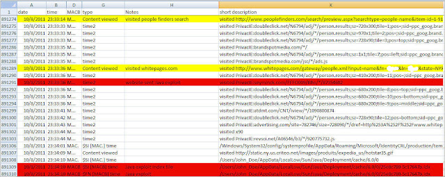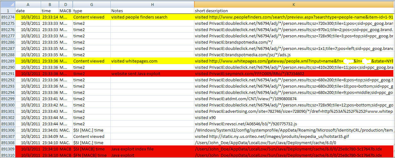 There was a PrivacIE entry for seyminck(dot)com/FFFO009/RRo/*87354602 which means the exploit came from third party content being displayed on a website. The PrivacIE entry was mixed in with activity resembling advertisements from the user searching for someone on peoplefinder and whitepages websites. I continued working backwards in the timeline but there was no more malware activity. The IIV was identified. A user was surfing the Internet when a website visited was hosting third party content which resulted in a successful drive-by download targeting a Java vulnerability.