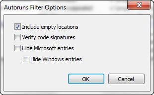 To track down the registry persistence mechanisms I first needed an authoritative resource on the various locations. The Autoruns utility is the best tool for reviewing auto-runs locations since it is constantly updated. The locations checked by the tool would be one of the most authoritative resources on the subject. I reached out to the Win4n6 group to see if anyone knew of a site that outlines the different places the tool checks. Both Troy Larson and Adam said the tool itself can be used to determine this. I picked my platform – Windows 7 64-bit – to get the best coverage of artifacts and followed their guidance. I ran Autoruns (v11.4) against my system. After it completed I selected Options from the menu then Filter Options on the drop down. In the Autoruns Filter Options window: checked the box next to Include empty locations and deselected Hide Windows entries followed by clicking OK.